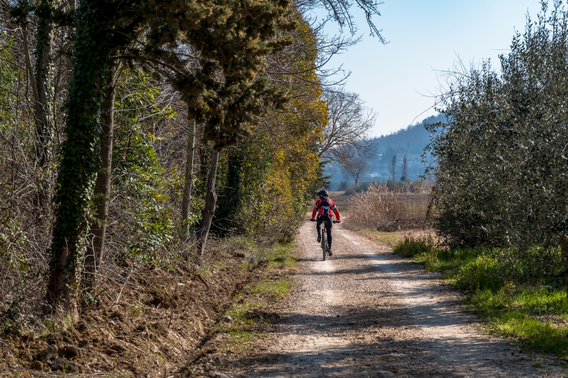 bike bicycle cyclist pathway wood trees sky clear sky man  Trasimeno